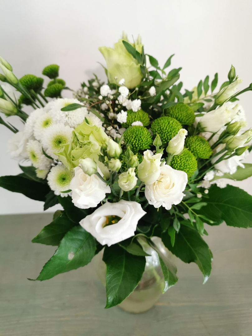 Der Grün- weiße Strauß geht immer. Für eine Elegante Firmeneröffnung oder zum Firmenjubiläum, Zum Geburtstag oder als Gratulation zur Geburt.